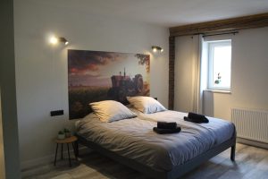 - 1 kleinere slaapkamer, ingericht voor 2 personen met eigen badkamer (WC, inloop douche, wasbak)